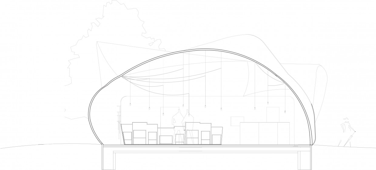 Multifunctional pavilion in a Viennese park. Location for concerts, readings and theater – capacity for 40 people. Different light and acoustic situations create individual setups for events. The building has a central box for auxiliary space and can open up to the natural surroundings.