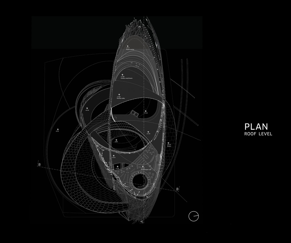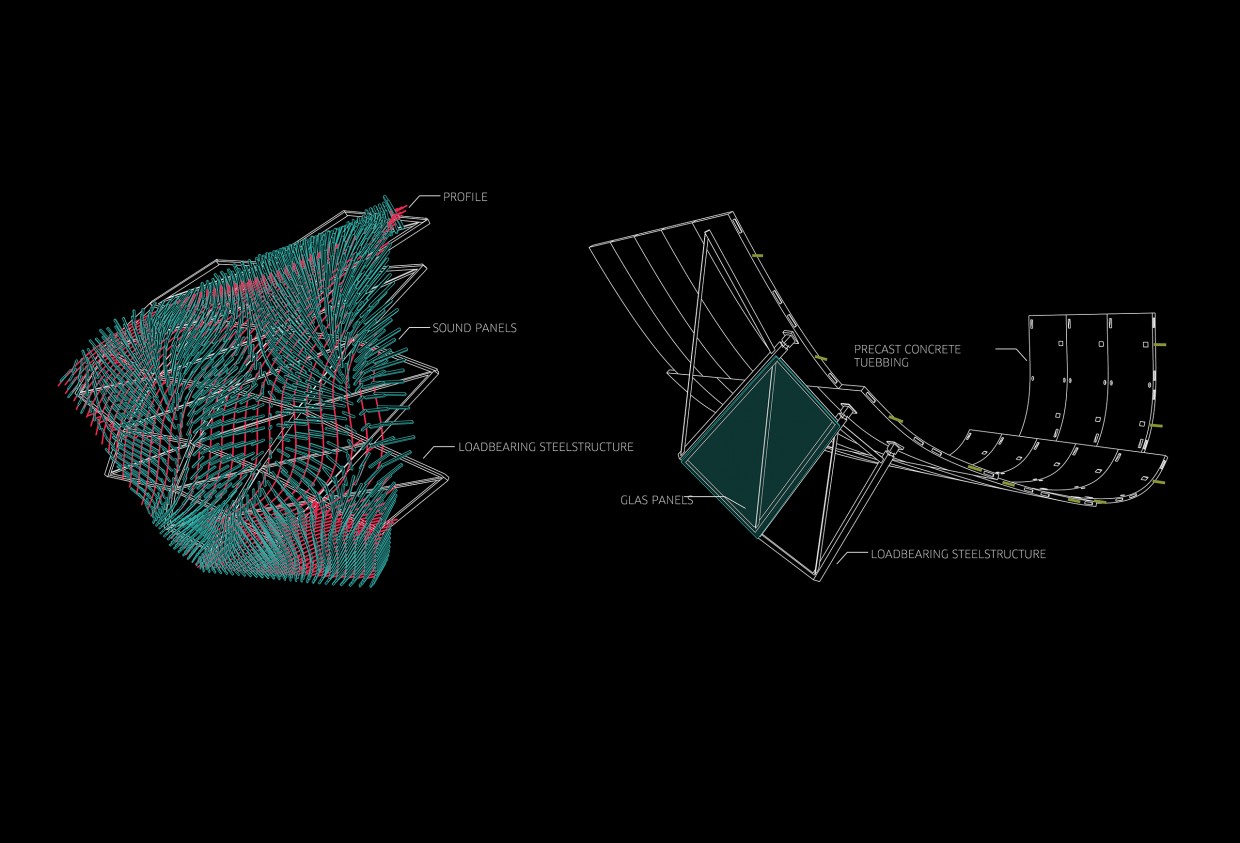 Located in the center of Vienna „Sonosphere“ makes the event of the theater part of the city and reinvents the relationship between the actor and the audience. The building itself performs through the matter of sound, creating different sonic effects and spacial illusions through geometry and materiality.