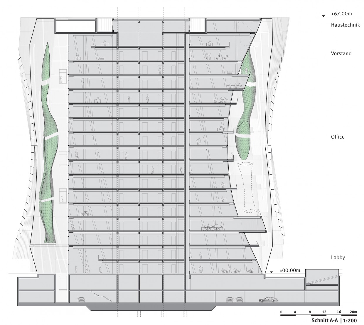 The elliptic shape and orientation of the building optimise its climate efficiency: The east and west facades, which are subject to high solar exposure, are protected by the buffer zone of the atriums as tall as the building itself with