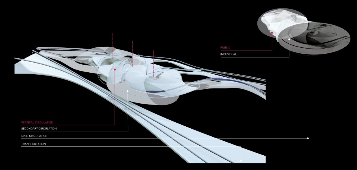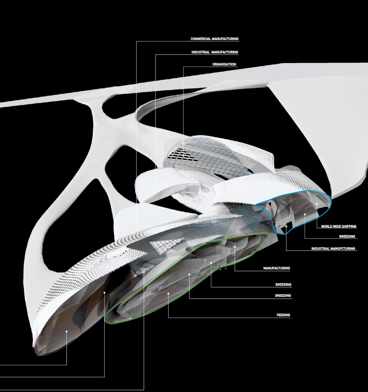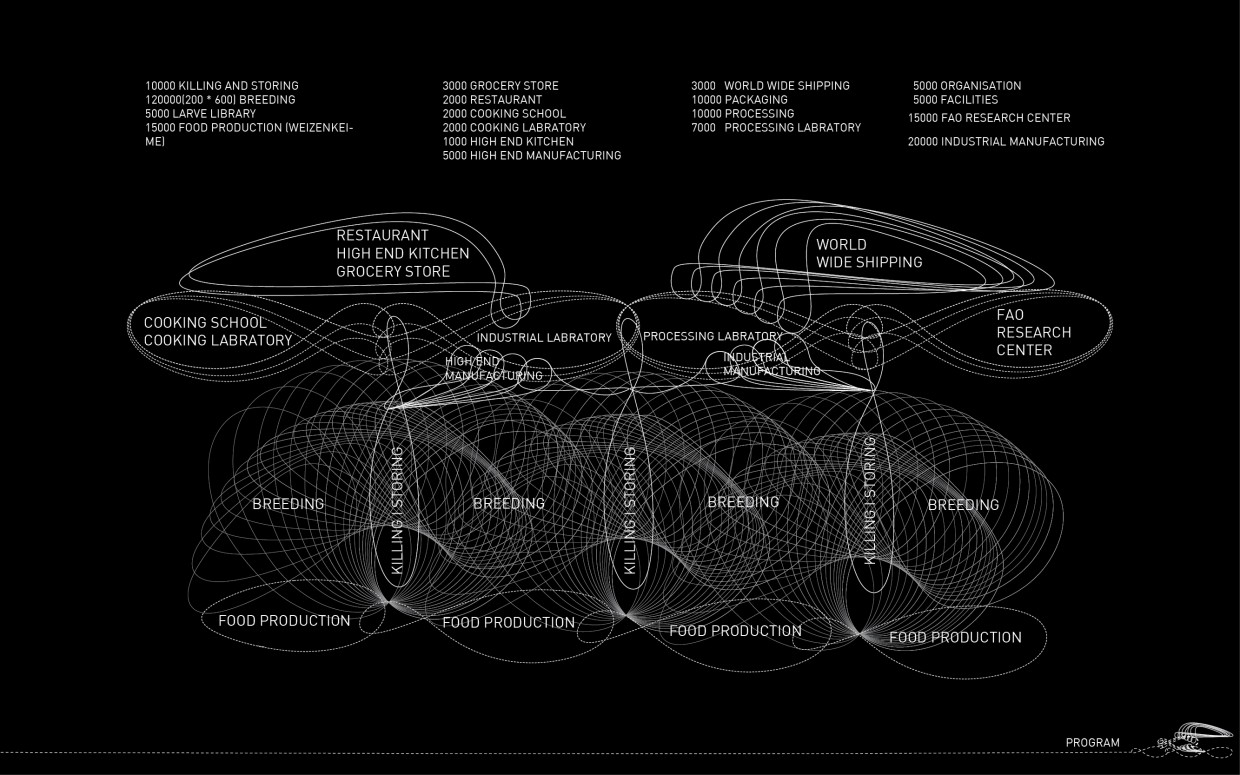 The building’s aim is to establish a renowned place for eating insects – introducing it to people, building up a better reputation in nowadays life and making it socially acceptable. The architecture is based on the geometry of nodes and rotations and lines. The building is divided into an industrial lower part for breeding, processing and shipping and an upper more opened structure for high end cooking schools and restaurants.