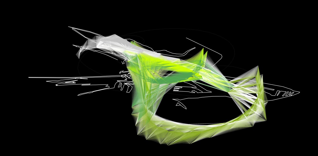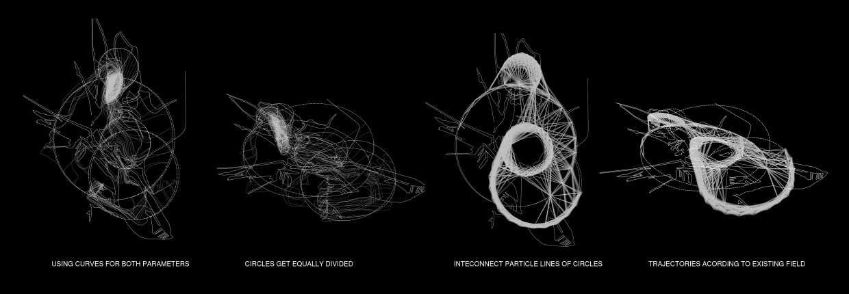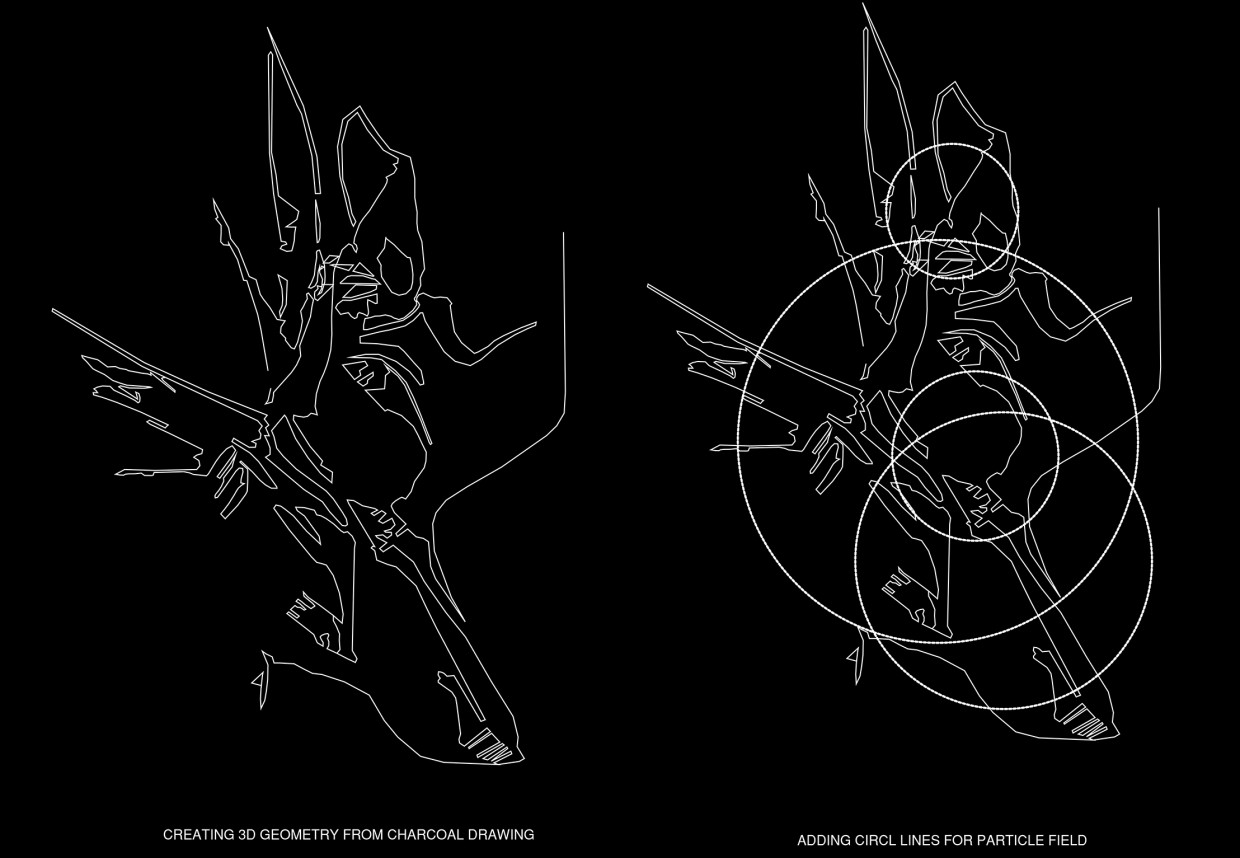 The goal of this workshop was to create a three dimensional quality through processing -starting with a handmade charcoal drawing. The lines of the drawing influence a particle field that creates a 3D network.
