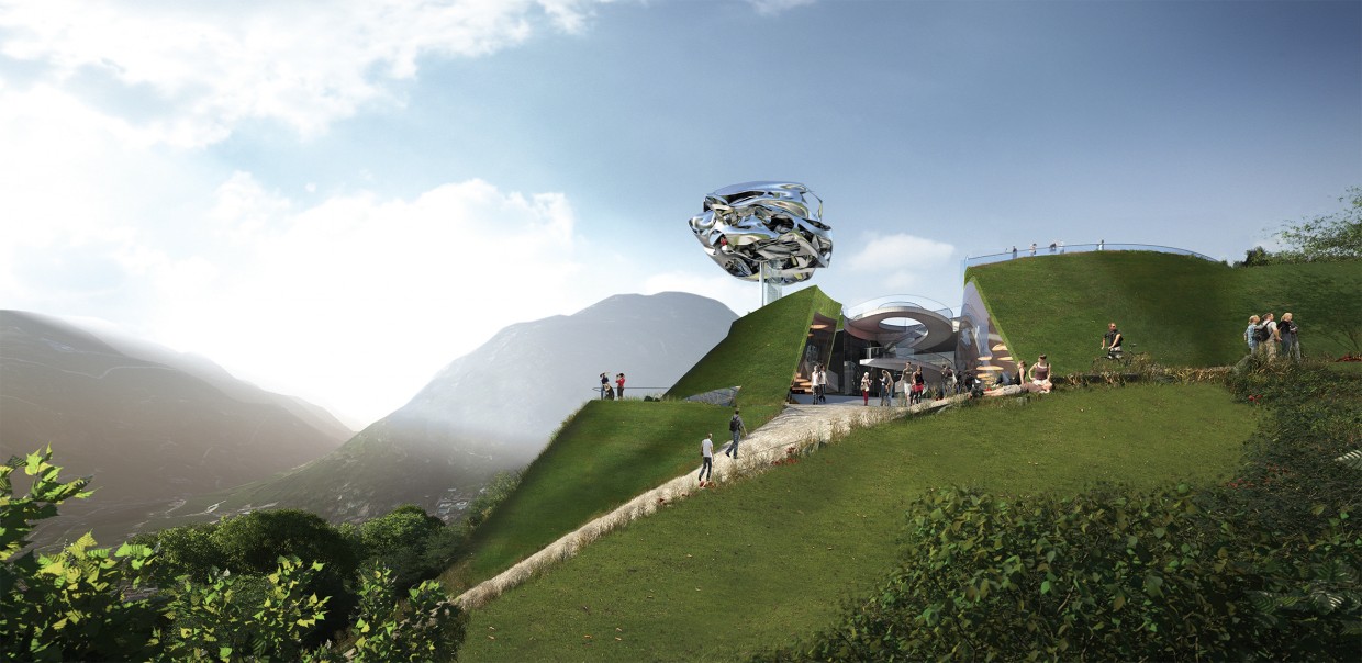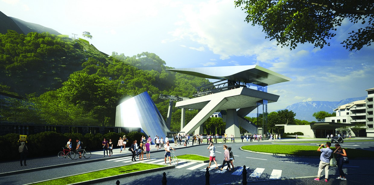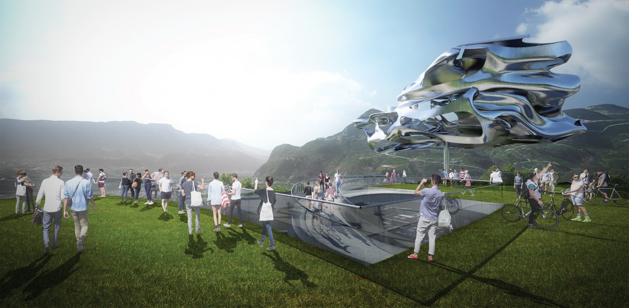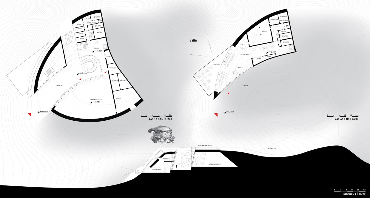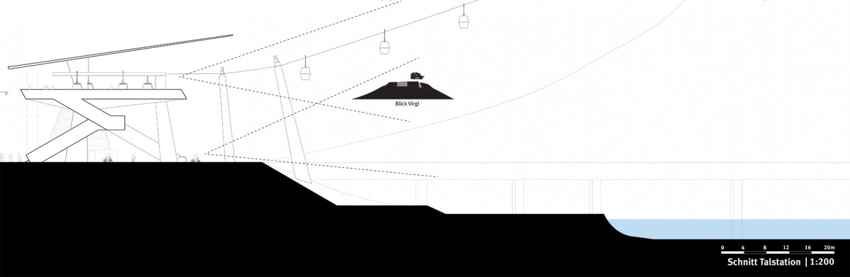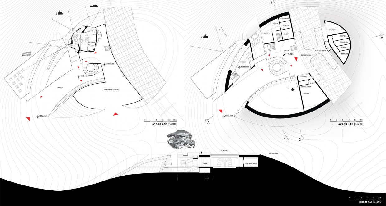 The top station for cable car in Bolzano, Italy is embedded into the landscape and includes a panoramic restaurant and a multifunctional space. The canyon inside the building acts as the main circulation path and the design is embedded into the landscape to integrate into the natural surrounding and to enable a 360 degree view.