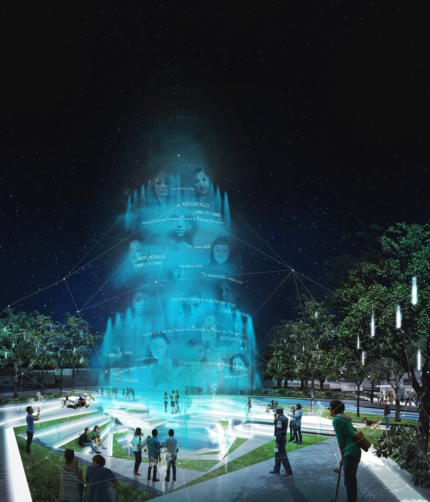 Children and families are used to seeing human trafficking all over town. Unhidden seeks to alert and educate the people of Tenancingo by altering the perception of the visitor. Through the fog sculpture, one is transported into the mind and heart of the victims. As one wanders through the mediascape, the underlying kinetic sensors are activated and the spectacle reveals the plight of the victims, letting their voices be heard. This evokes an emotional connection with the victims which enriches social awareness, inspires conversation and fosters humanitarian mediation.